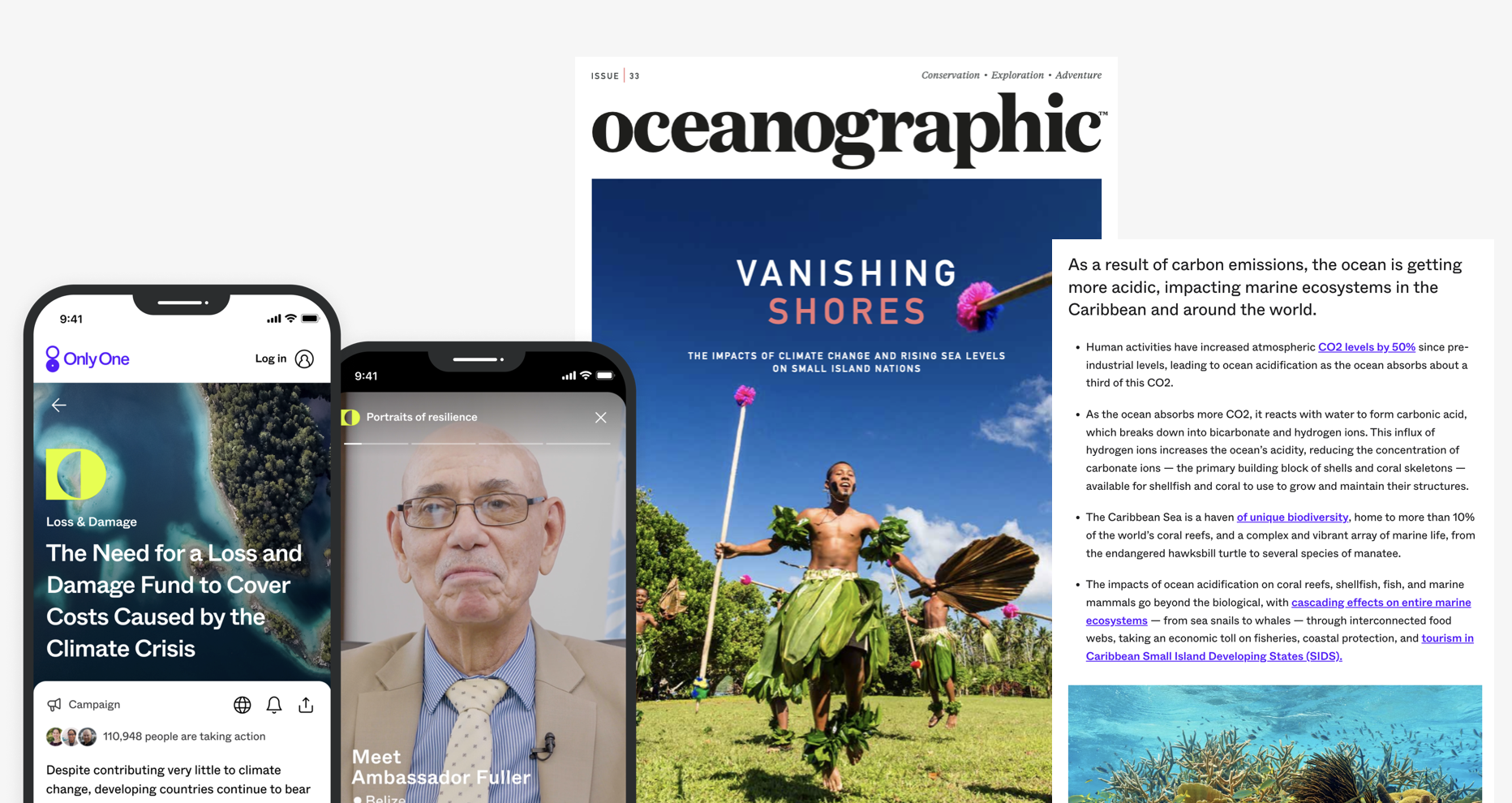 In 2023, we partnered with the Alliance of Small Island States (AOSIS) on a campaign and content series to raise awareness of the disproportionate impact of the climate crisis on small islands and the need for climate finance. We created an original film series highlighting challenges faced by four different island nations, produced an entire edition of Oceanographic Magazine, and designed the AOSIS pavilion at COP28 UAE in Dubai —where, on the first day, nations formerly launched the loss and damage fund and committed more than $700 million to help developing countries manage climate-related costs.
